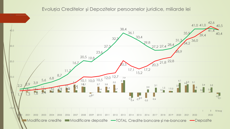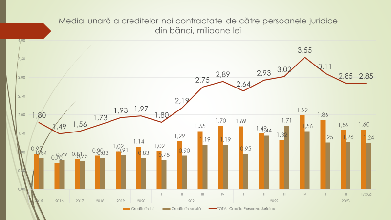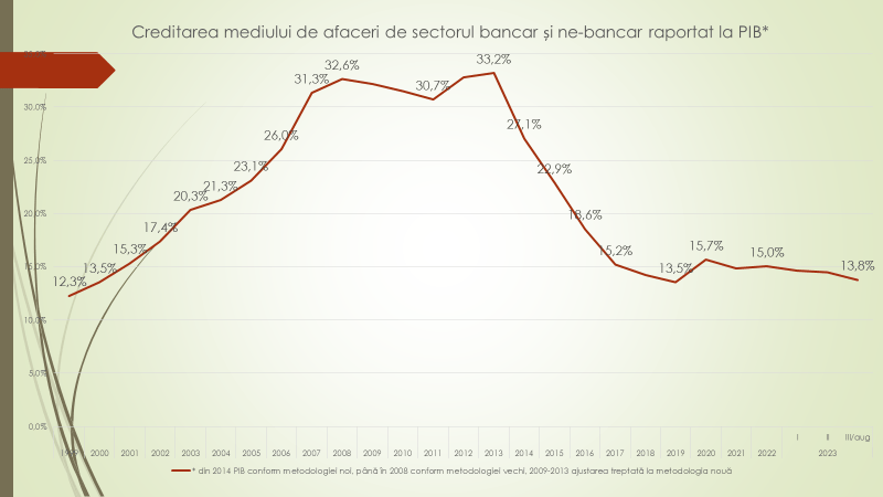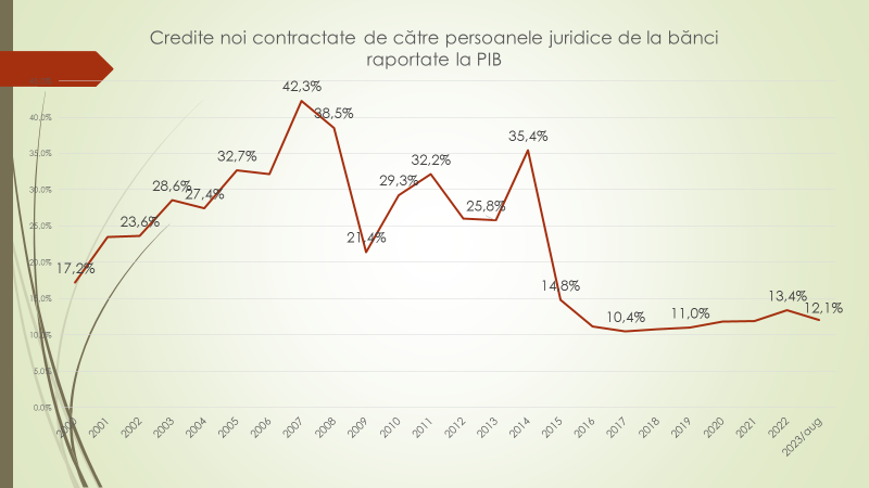 Vorbind despre media anuală a creditelor noi luate, raportată la PIB, a afirmat că în 2000, s-au luat credite de 17,2% din PIB. A crescut până la 42 procente în 2007. Criza din 2009 a prăbușit creditarea la 21,4% din PIB, ca ulterior să crească la 35% în 2014. Din 2016, volumul de credite noi accesate de către agenții economici este la nivel de 10-13%. Anul acesta, 2023, este 12%.