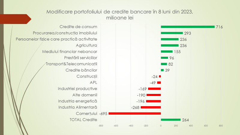 Totodată, portofoliul de credite destinat companiilor de construcții a scăzut cu 24 de milioane de lei, cel destinat administrațiilor publice locale – cu 49 de milioane de lei, al industriei productive – cu 169 de milioane de lei; al diferitor ramuri ale economiei –cu 190 de milioane de lei, al industria energetică – cu 196 de milioane de lei, al industria alimetară – cu 268 de milioane de lei, al comerțului – cu 695 de milioane de lei. „Acum 2,8 miliarde de lei lunar se i-au credite de către agenții economici. Creditarea netă este totuși negativă, deoarece ei întorc mai multe credite decât au luat. Dar creditele noi pe care le i-au sunt mai mici ca volum decât credite vechi care se întorc”, a spus Veaceslav Ioniță.