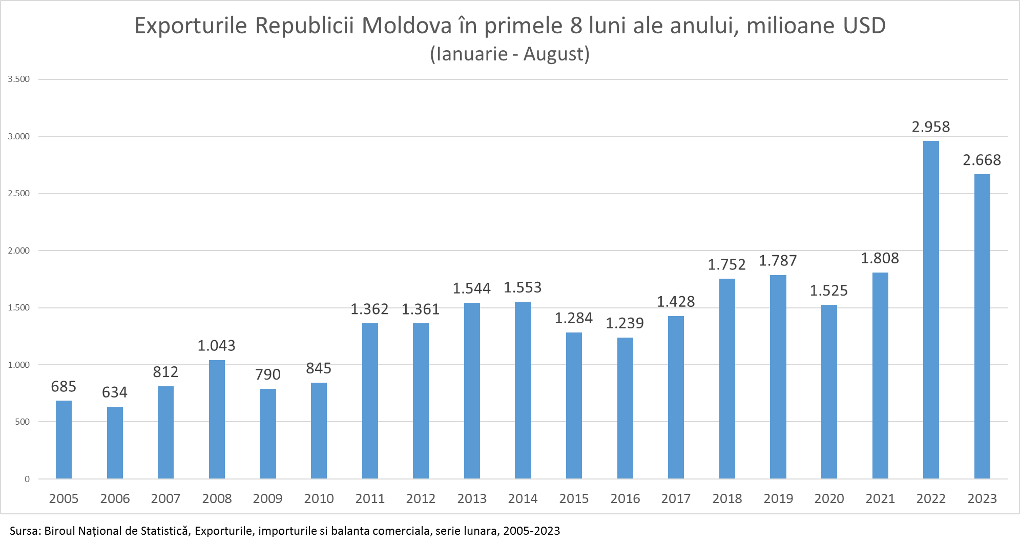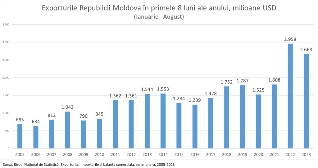Exporturile în primele 8 luni ale anului 2023 au fost cu 10% mai mici decât anul trecut și au însumat 2,67 miliarde USD comparativ cu 2.96 miliarde anul trecut.