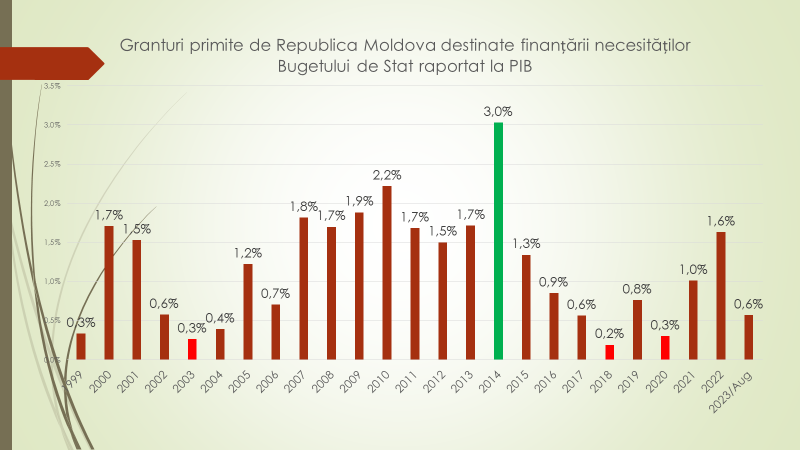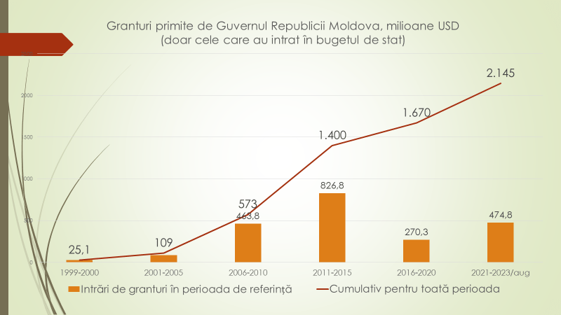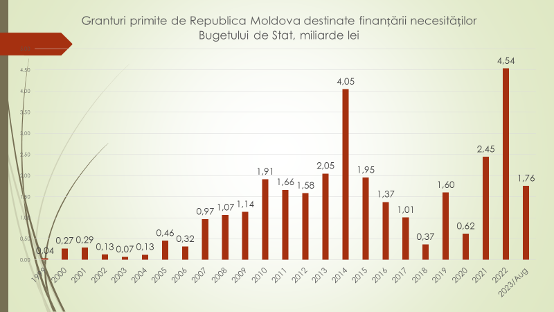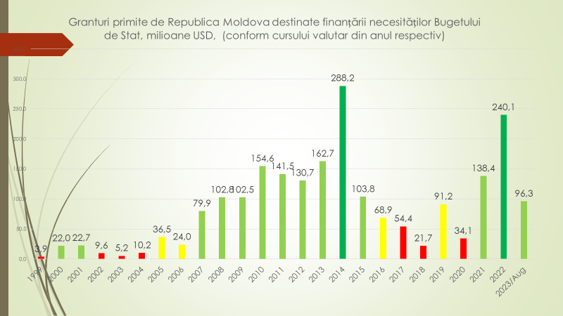 Potrivit expertului, 2014 a fost anul când Republica Moldova a semnat Acordul de Asociere cu Uniunea Europeană și a fost primul an când a primit asistență, sub formă de granturi, pentru a dezvolta infrastructura țării. În 2022 a primit bani din partea Uniunii Europene legat de războiul din Ucraina, legat de criza energetică. „O parte considerabilă de bani vin pentru Republica Moldova dar nu doar în bugetul de stat, dar și prin diverse proiecte. Republica Moldova primit de la țările din UE, din SUA, de la țările dezvoltate, în ultimii 20 de ani circa 2,2 miliarde de dolari”, a spus expertul.