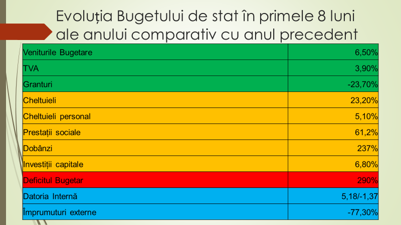 Expertul a menționat că veniturile bugetare în acest an, în primele opt luni, au 6,5% creștere. La inflația pe care am avut-o de 20%, acest lucru înseamnă că venituri sunt mai mici decât anul trecut. TVA doar 3,9% creștere. Astfel, continuă tradiția de a avea încasări din TVA în valori reale negative. „În acest an, în primele opt luni, granturile au fost cu 24% mai mici decât anul trecut. Veniturile au crescut cu 6,5%, iar cheltuielile cu 23%. Eveniment că deficitul bugetar a crescut. Cheltuielile de personal au crescut cu 5,1%. Asta înseamnă că salariile la bugetari sunt mici. Prestațiile sociale – aici Guvernul a fost nevoit să ofere cu 61 % mai mult. Avem mulți pensionari, nu avem lucrători. Dobânzile creditelor au crescut cu 237%. Am plătit dobânzi de 2,4 ori mai multe decât anul trecut. La creșterea prețurilor, investițiile capitale în acest an au fost de 6,8%, cu mult mai mici decât anul trecut”, a menționat Veaceslav Ioniță.