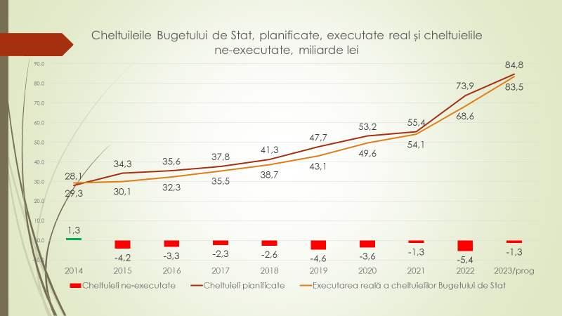 Referitor la datoria internă, economistul a remarcat că anul trecut, în opt luni, nu s-a luat niciun leu de pe intern, dar s-au întors 1,37 milioane de lei dobânzile pentru creditele precedente. În acest an, sun de 5,18 miliarde de lei datoriile interne fără datoriile luate prin hârtii de valoare de stat, fără datoriile luate de la bănci. În total, peste 6 miliarde de lei. „În acest an, vom avea ceea ce am avut în ultimii opt ani. Începând cu 2014, bugetul de stat se aprobă, dar nu se execută. Anul trecut, s-a aprobat 73,9 miliarde de lei, s-a executat 68,6 miliarde de lei. 5,4 miliarde de lei nu s-au executat. Tăiem de la investiții, de la subvenții, pe care le amânam pe următorul an și alte cheltuieli. În fiecare an, nu au fost executate bugetele de aproape 30 de miliarde de lei. Votăm cheltuieli, în special investiții, și nu se execută”, a declarat economistul.