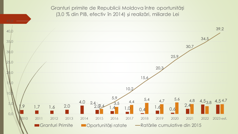 Economistul susține că Republica Moldova, fiind o țară slab dezvoltată, ar avea nevoie de un efort financiar, ca să-și dezvolte infrastructura, de circa 10% din Produsul Intern Brut (PIB). La valoarea leului de astăzi – circa 30 de miliarde lei, bani pe care bugetul de stat nu-i are în acest sens și ar trebui să vină din exterior. „Raportat la PIB, de la 1,7% în 2013 la 3% în 2014, după ce a fost semnat Acordul de Asociere, a crescut suportul financiar extern. Trebuia să crească continuu spirjinul financiar extern, dar a avut loc jaful bancar, care ne-a prăbușit și am rătat sume enorme. În 2015 am primit 2 miliarde de lei, dar am ratat 2,4 miliarde de lei. În 2016 a primit 1,4 miliarde de lei, dar am ratat 3,5 miliarde de lei. În 2020 am primit 600 de milioane de lei, dar am ratat 5,6 miliarde de lei. Din 2015, după jaful bancar, și până în prezent, s-au ratat, sub formă de granturi, 39,2 miliarde lei. Partenerii nu au vrut să aibă de a face cu o țară unde se fură miliarde de lei și nimeni nu pățește nimic”, susține expertul.