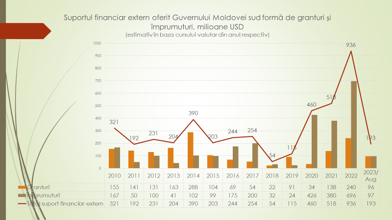 Potrivit economistului, în 2010 au fost 321 de milioane de dolari suport financiar extern, dintre care granturi de 155 de milioane de dolari, iar împrumuturi – de 167 de milioane de dolari. Din 2010 și până în 2014 au dominat granturile. În 2014 granturile au fost de 288 de milioane de dolari, iar împrumuturile – de 102 milioane de dolari. În total, 390 de milioane de dolari suport financiar extern. Între 2010-2020 granturile au dominat în fiecare an. După 2020 lucrurile s-au schimbat. „Anul trecut am avut un suport financiar extern de 936 de milioane de dolari. Granturile au fost 240 de milioane de dolari, iar împrumuturile – 696 de milioane de dolari. Chiar dacă au dominat împrumuturile, este bine. Împrumuturile externe sunt mai ieftine decât cele interne. Anul trecut, am avut, pe intern, cea mai mare dobândă din ultimii ani și anul trecut a fost unicul an când împrumuturi interne nu s-au luat, dar s-au întors împrumuturile externe pentru a diminua șocurile de plăți mari. Peste 20% a fost dobândă bancară plătită pentru pentru creditele luate pe internet anterior”, a spus economistul.