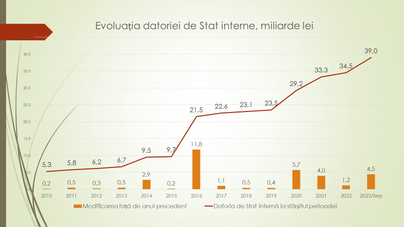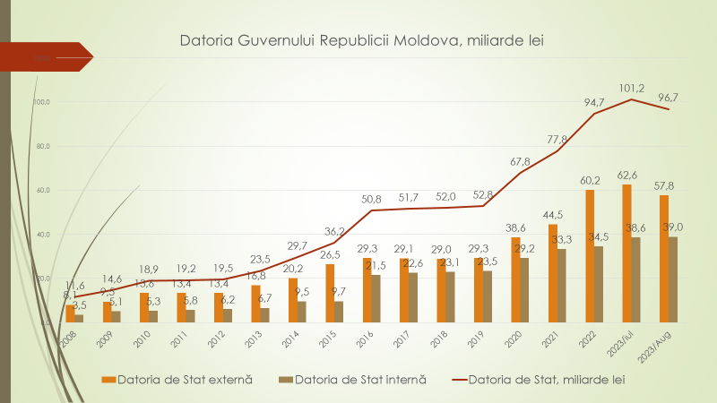 „În luna iulie, acest an, pentru prima dată în istoria țării datoria Guvernului depășit 100 de miliarde lei și a fost 101,2 miliarde de lei. Datoriile interne cresc. Până în 2015, datoria externă era 55%, iar 40-45 % – datoria internă, care este mai scumpă și bugetul de stat plătește mai mult. După jaful bancar, a crescut datoria internă și s-a ajuns la 70%. În 2022, pentru prima dată s-a reușit să se împrumute ieftin pe extern, ca să fie întoarsă datoria pierdută. În 2023, din pacate, cheltuieli avem foarte mari, iar veniturile sunt foarte mici. Pe extern nu ne putem lua împrumuturi, împrumutăm la greu de pe internet, la o dobândă foarte mare și vom plăti enorm pentru acest lucru. Avem nevoie de sprijin extern pentru că Republica Moldova se află într-o mai dificultate”, a declarat economistul.