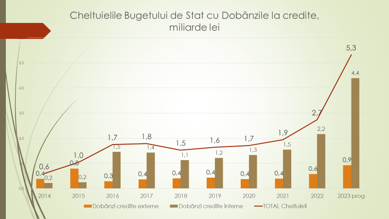 Veaceslav Ioniță afirmă că pentru creditele externe, începând cu 2016, Republica Moldova achită, în mediu, anual, de la 1% la 1,5%. Datoria internă, în cei mai buni, a costat 4,5% anual. De trei ori mai scump. În acest an, avem cea mai mare dobândă. Deservirea datoriei interne va costa bugetul de stat- 11,3%. Mai scump de opt ori decât dobânda externă. De pe extern nu s-a luat împrumuturi deloc. Doar de pe intern. Anul trecut s-au plătit 2,7 miliarde lei pentru dobânzile datoriilor, dintre care 2,2 miliarde de lei pentru datoria internă și 600 de milioane de lei pentru datorie externă. În acest an, vom plăti 5,3 miliarde de lei pentru dobânzi. Investițile Guvernului în opt luni ale anului au fost de 800 de milioane de lei, iar plata dobânzii – de 3,5 miliarde lei. Din cele 5,3 miliarde de lei, pentru dobânzile creditelor interne vor merge 4,4 miliarde lei, pentru al creditelor externe – 900 de milioane de lei. În acest an, avem de plătit pentru dobândă la creditele luate de către Guvern o sumă dublă față de anul trecut și incomparabilă cu oricare altă perioadă din istoria Republicii Moldova”, a afirmat expertul.