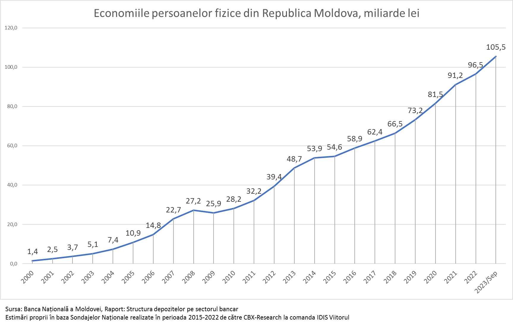Peste 60% din toate economiile monetare ale populației sau 64,4 miliarde lei sunt sub formă de depozite în bănci. În baza sondajelor realizate în perioada 2015-2022 de către CBX-Research la comanda IDIS Viitorul, estimăm că 32,2 miliarde lei sunt bani strânși acasă, iar alte 8,8 miliarde lei sunt împrumuturi oferite rudelor și prietenilor.