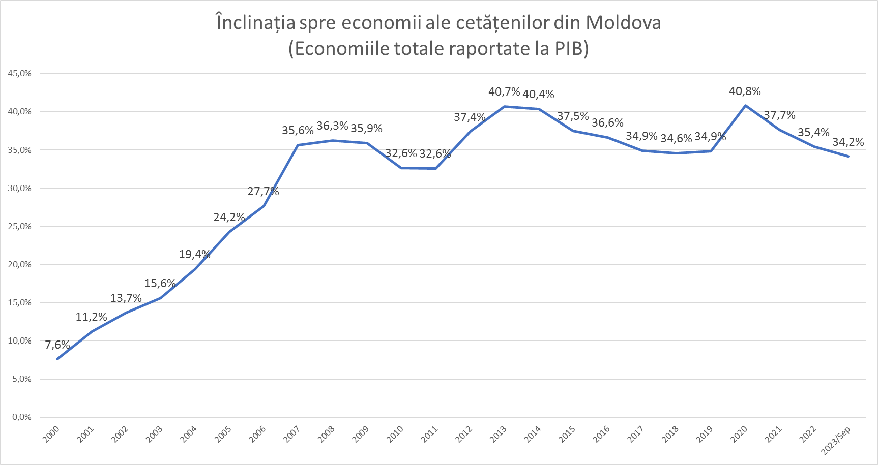 Înclinația spre economii a moldovenilor, determinată ca Raportul dintre Economii la PIB a atins cotele maxime în anii 2013 și 2020, când au constituit aproape 41%. În prezent, din cauza crizelor prin care trece Moldova în ultimii 3 ani, înclinația spre economii a înregistrat o ușoară scădere ajungând la 34,2%. Monetar vorbind economiile moldovenilor în prezent sunt cu 20 miliarde lei mai mici, decât ar fi fost, dacă mențineam aceeași înclinație spre economii ca în perioada pre-criză. De fapt sunt banii, care au fost direcționați în ultimii 3 ani spre cheltuielile critice legate de creșterea prețurilor.
