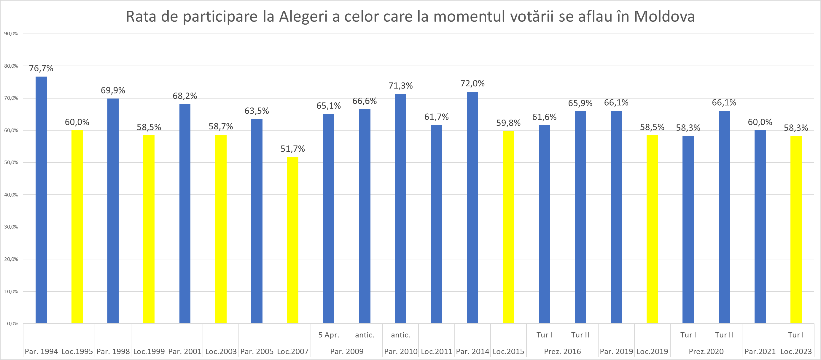 La alegerile locale din 5 noiembrie 2023, au participat 1.147,6 mii alegători, cea ce în valori absolute reprezintă minimul înregistrat vre-o dată în Moldova. Precedentul minim a fost în 2007, când la alegerile locale au participat 1.207 mii alegători.