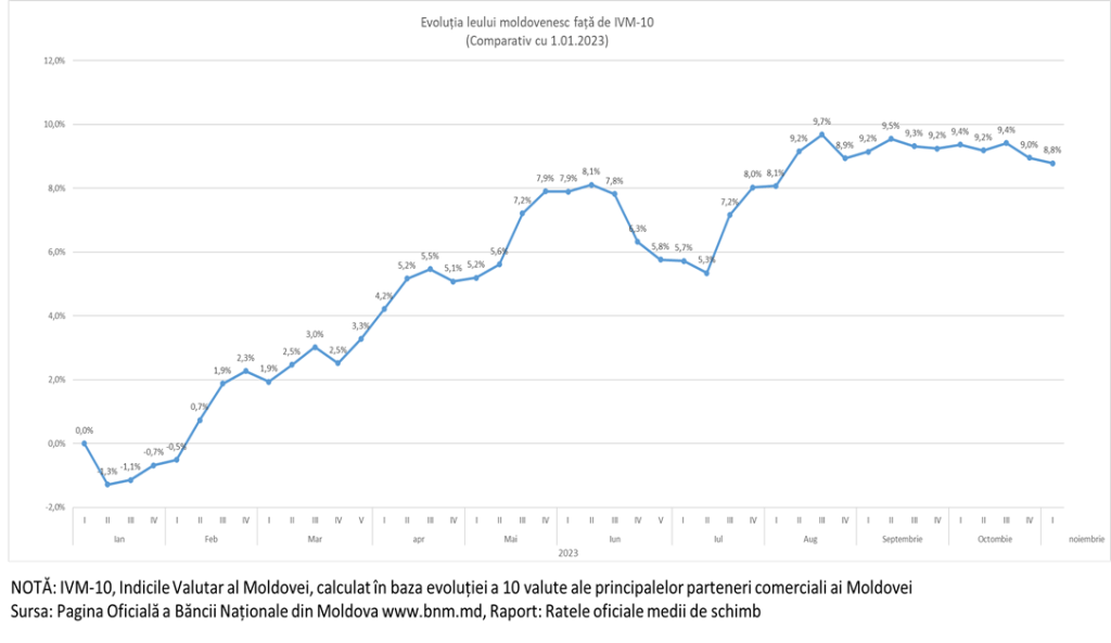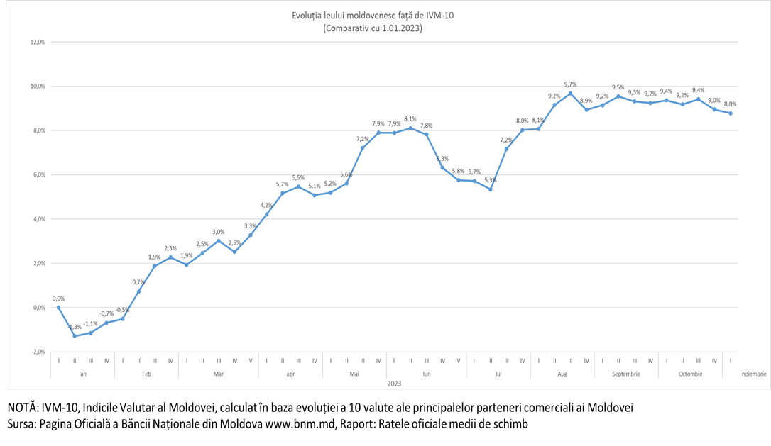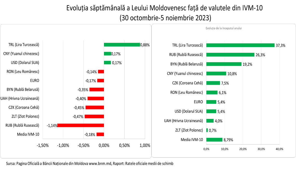 Da la începutul anului Leul Moldovenesc rămâne a fi mai puternic decât toace cele 10 valute din coșul valutar IVM-10 a principalelor partenerilor noștri comerciali. Cea mai mare apreciere a înregistrat față de Lira Turcească(+36,8%), Rubla Rusească(+27,1%) și Rubla Belarusă(+19,2%)