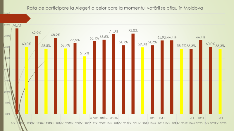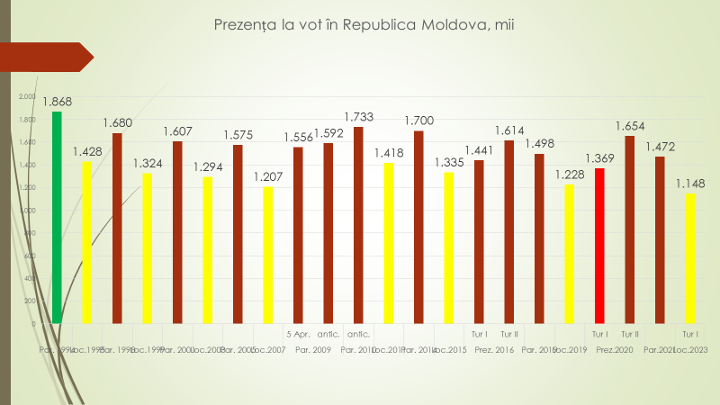 Veaceslav Ioniță spune că au mers să voteze duminică, 5 noiembrie 2023, la alegerile locale generale, 1 milion și aproape 148 de mii de moldoveni, care este cel mai mic număr de alegători pe care Republica Moldova l-a avut vreodată la alegerile pe care le-a organizat la nivel național. Dar, trebuie de ținut cont și de faptul că numărul populației Republicii Moldova scade. „Conform estimărilor mele, la 5 noiembrie, în țară se aflau 1 milion 970 de mii de alegători, cu 800 de mii mai puțini decât sunt pe listele electorale. Prezența la vot a fost de 58,3%. Dacă luăm după prezența la vot și după oamenii din țară, am avut acum cea mai proastă prezență la alegeri. O astfel de situație a fost în 2007, când s-au prezentat 51,7% de alegători”, a spus Veaceslav Ioniță.