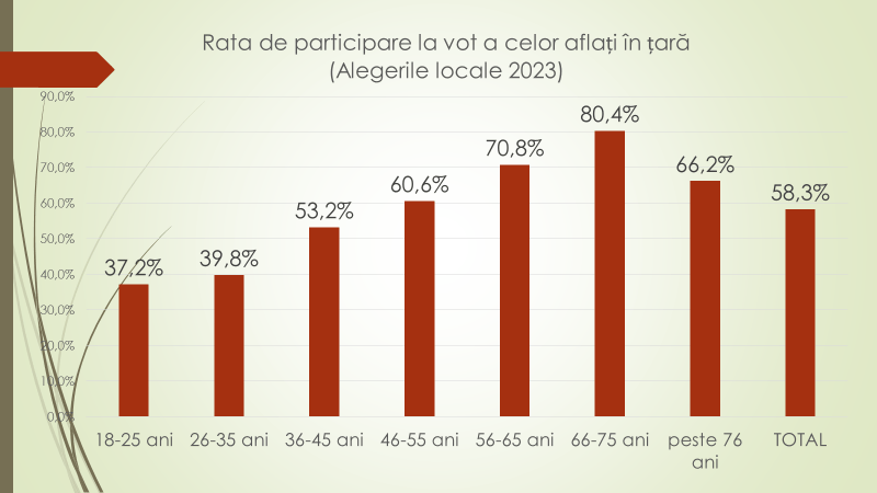 Expertul susține că tinerii aflați în țară la 5 noiembrie în țară au avut cea mai slabă prezență la vot din toată istoria participării tinerilor în alegeri. Doar 37,2%. „Între timp au mai plecat peste hotare, iar în prezent numărul lor este mai mic. Chiar și așa, ar fi trebuit să fie prezența lor la vot de 39%. În timp ce vârstnicii merg la vot în proporție de 80%, tinerii sunt 37,2%. Aceasta trebuie să trezească îngrijorare la toată clasa politică”, susține expertul.