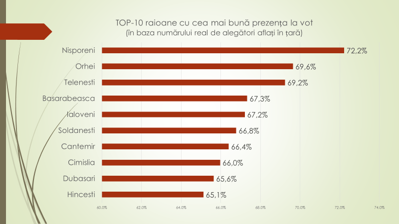 Femeile au avut o rată de participare de 59,5%, iar bărbați – 56,1%, a declarat economistul Populația proeuropeană, care votează partidele de dreapta, partidele proeuropene, a avut cea mai bună prezență la urne. Populația din centrul țării a participat în proporție de 64,6%. Municipiul Chișinău a avut cea mai slabă prezență – 50,8%. La nord prezența la urne a fost de 57,8%, la sud 61,1%, iar în UTA Găgăuză – 58,9%. „ Primele 10 raioane cu cea mai bună prezență la vot la alegerile de duminică sunt: Nisporeni – 72,2%; Orhei – 69,6%; Telenești – 69,2%; Basarabească – 67,3%; Ialoveni – 67,2%; Șoldănești – 66,8%; Cantemir – 66,4%; Cimișlia – 66%; Dubăsari – 65,6%; Hâncești – 65,1%. Primele 10 raioane cu cea mai slabă prezență la vot sunt: municipiul Chișinău – 50,8%; municipiul Bălți – 53,7%; Sângerei – 55,2%; Ocnița – 55,4%; Drochia – 55,8%; Căușeni – 56,6%; Briceni – 57%; Râșcani – 57,1%; Ungheni – 57,9%; Anenii Noi – 58%”, a declarat economistul.