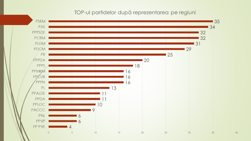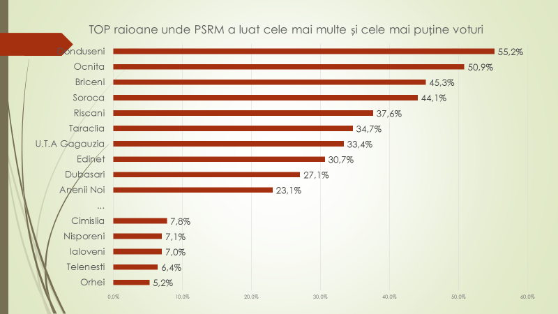 Cei mai mulți dintre moldoveni care sunt PSRM, afirmă expertul, sunt la Dondușeni – 55,2%; Ocnița – 50,9%; Briceni – 45,3%; Soroca – 44,1%; Râșcani – 37,6%. La polul opus, raioanele care nu sunt pentru PSRM, sunt: Orhei, Telenești, Ialoveni, Nisporeni și Cimișlia. PSDE cel mai bine stă la Șoldănești – 28,7%; Nisporeni – 27,3%; Hâncești – 23,4%; Fălești – 18,4%; Cimișlia – 16,4%. Mai puțini susținători are în municipiile Bălți, Chișinău, Orhei și raioanele Rezina și Dondușeni.