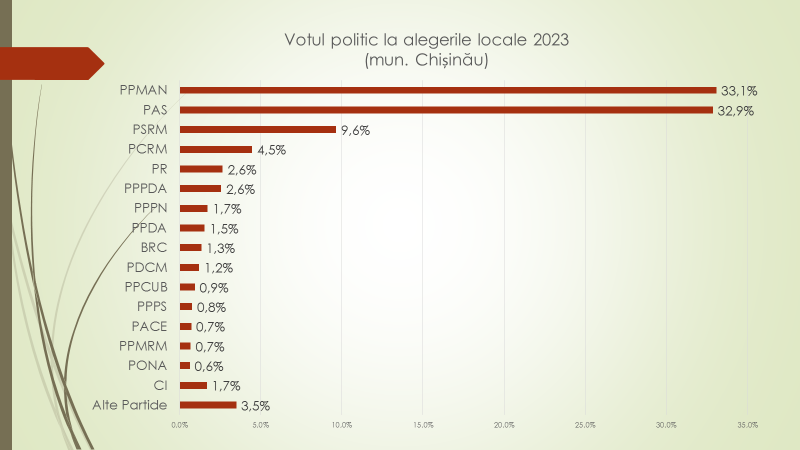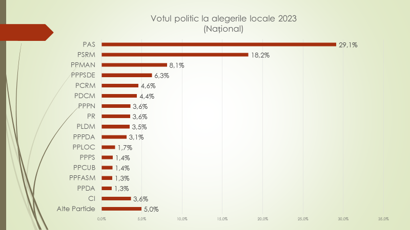 Potrivit lui Veaceslav Ioniță, PSRM a fost prezent în toate cele 35 de regiuni administrative ale Republicii Moldova; urmat de PAS care a participat în aceste alegeri în 34 de regiuni. PSDE și PCRM au candidat în 32 de regiuni, PLDM în 31, PDCM în 29, PR în 25; PDA în 20 etc.. Astfel, ca rezultat, la nivel național, votul politic dar pentru PAS este de 29,1%; pentru PSRM – 18,2%; pentru MAN – 8,1%; PSDE – 6,3%; PCRM – 4,6%; PDCM – 4,4%; iar pentru PN – 3,6% etc.. În municipiul Chișinău, votul politici dat pentru MAN este de 33,1%; pentru PAS de 32,9%; PSRM – 9,6%; PCRM – 4,5% etc.. „MAN este puternic în municipiul Chișinău și lipsă în restul țării, PSDE este lipsa în Chișinău și prezent pe țară. Aceste două partide, MAN și PSDE, dacă ar fi împreună ar fi o forță care ar lua 15%. Logica politică și statistica electorală sugerează că MAN și PSDE au doar de câștigat dacă fuzionează”, a spus Veaceslav Ioniță.
