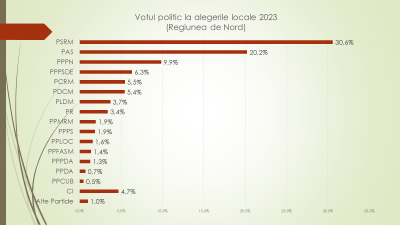 Analistul economic declară că în regiunea de nord PSRM a luat 30,6% din voturile alegătorilor; PAS – 20,2%; Partidul Nostru (PN) – 9,9%; PSDE – 6,3%; PCRM – 5,5%; PDCM – 5,4% etc.. În regiunea de centru, PAS detașat ocupă primul loc cu 35,4%; PSRM – 12,8%; PSDE – 10%; PDCM – 6,7%; PLDM – 5.4%. În regiunea de sud, PAS – 30,5%; PSRM – 18,4%; PSDE – 8,6%; Partidul Renaștere (PR) – 5,6%; PPDA – 5,4%. În UTA Găgăuzia: PSRM – 33,4%; PR – 32,4%; Partidul Bugeacului – 17,1%; PN – 5,1%.