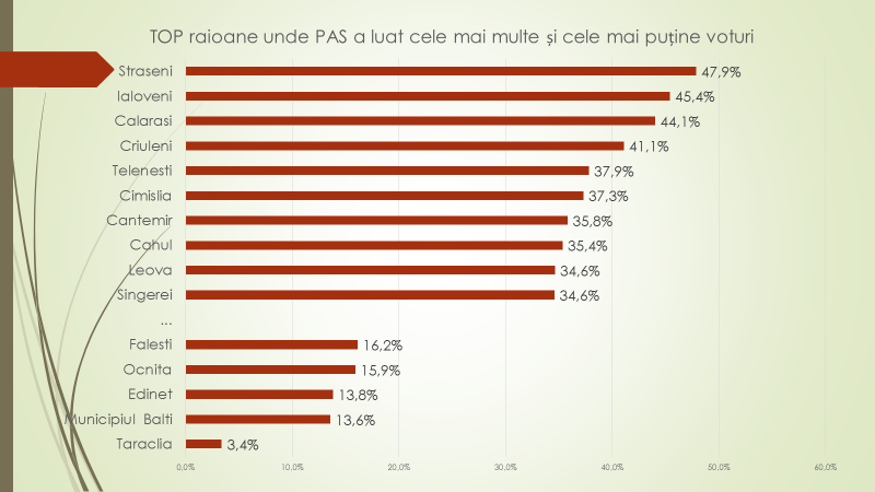 „PAS cel mai bine stă în raionul Strășeni – 47,9%; Ialoveni – 45,4%; Călărași – 44,1%; Criuleni – 41,1%; Telenești – 37,9%; Cimișlia – 37,3%. Este un partid proeuropean, iar cea mai bună prezență o are în centru Republicii Moldova, care este și cea mai proeuropeană regiune din Republica Moldova. Raioanele care nu susțin PAS sunt: Taraclia, municpiul Bălți, municipiul Edineț, raioanele Onița și Fălești”, a declarat analistul economic.