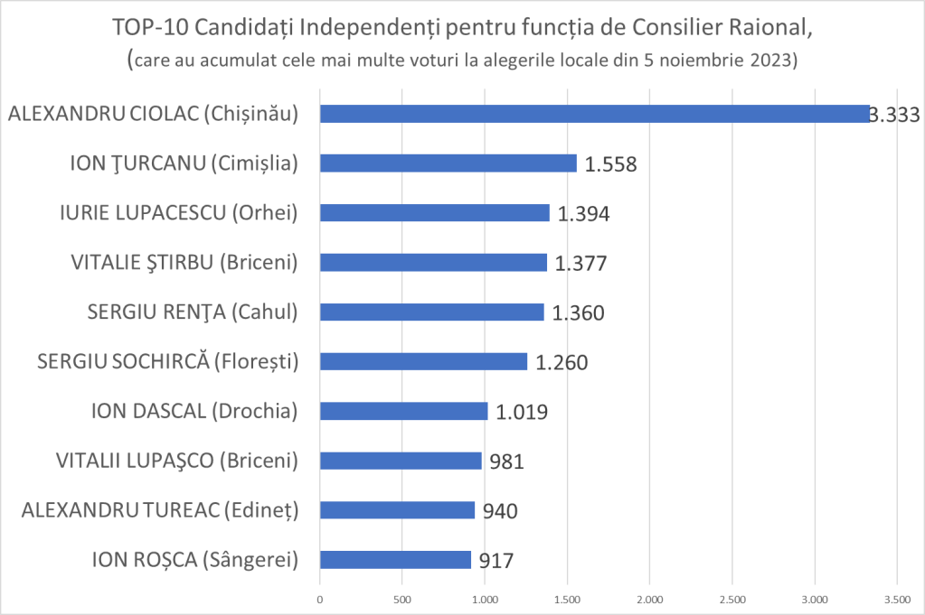 Din primii 10 Candidați Independenți pentru funcția de consilier raional, cu cel mai mare număr de voturi, 6 sunt din regiunea de Nord, 2 din Sud și câte unul din Centru și mun. Chișinău.