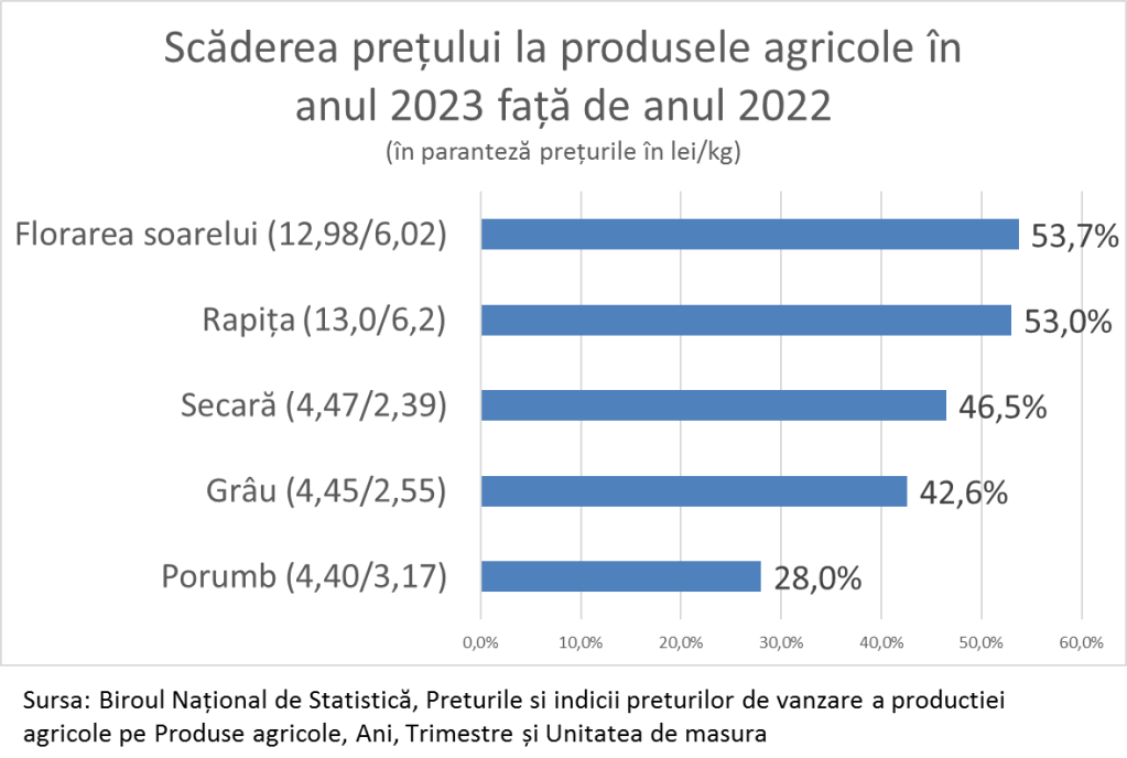 Deoarece prețurile la producția agricolă în acest an a scăzut de două ori, față de anul trecut. De la 28% la porumb, până la 53,7% la floarea soarelui.