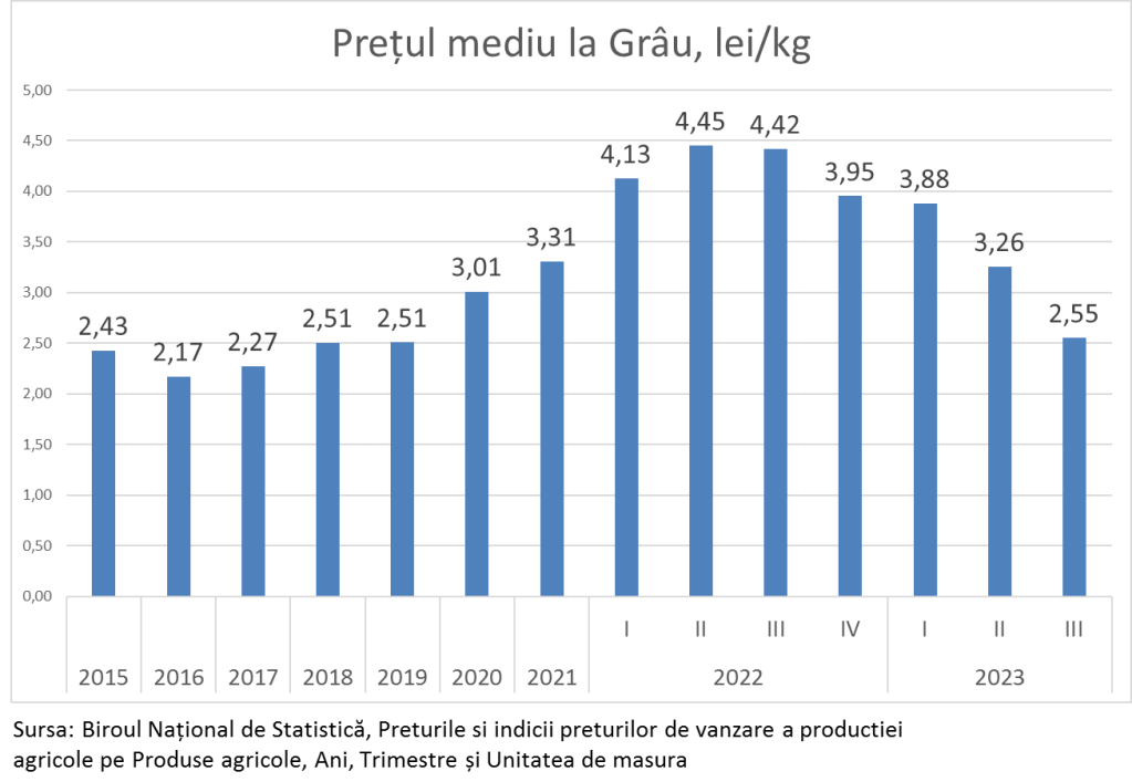 Priviți cu atenție evoluția prețului la grâu, care costă astăzi 2,55 lei/kg similar cu anul 2019.