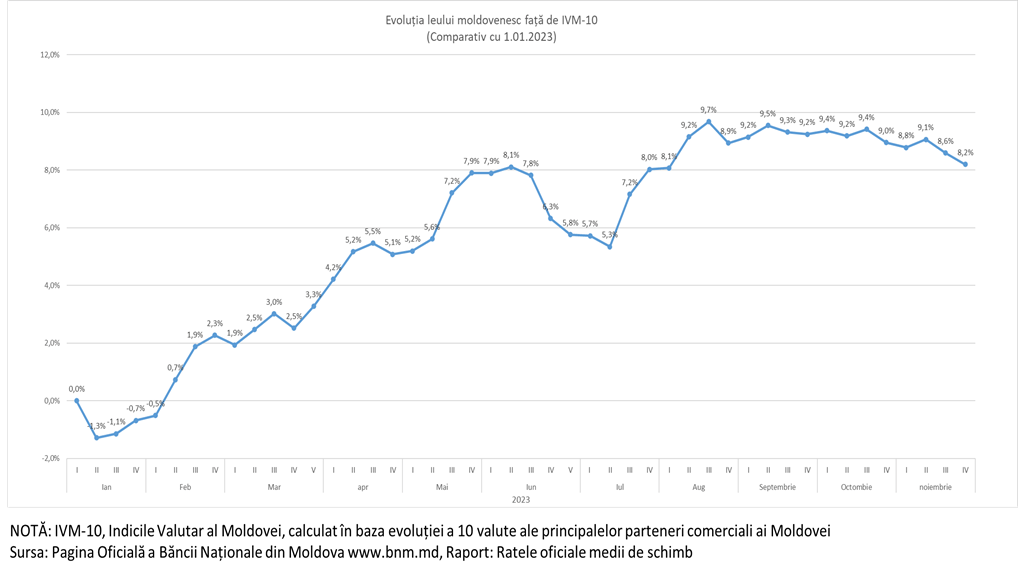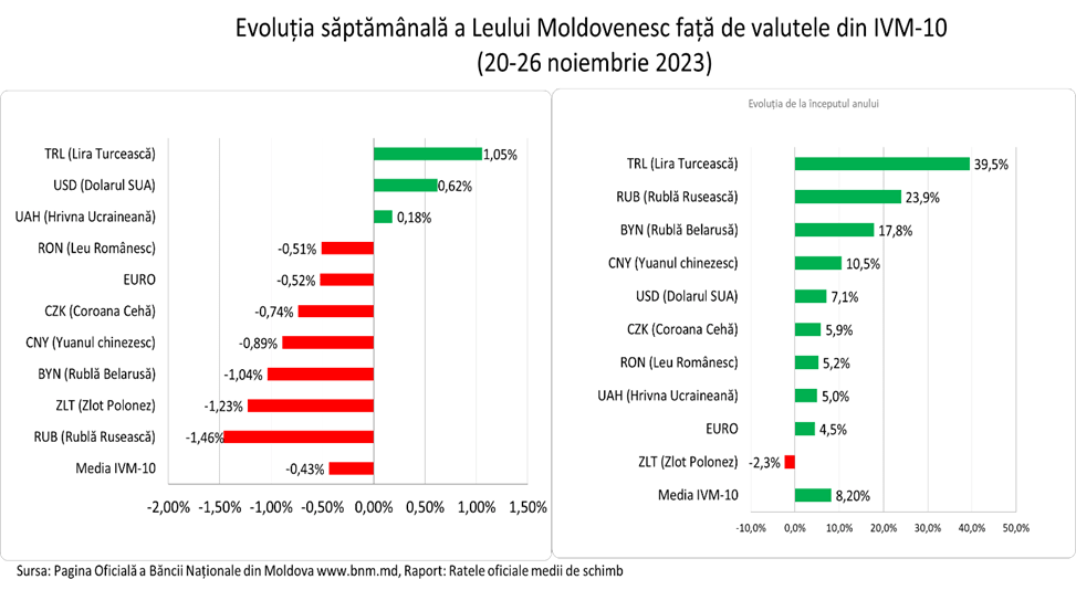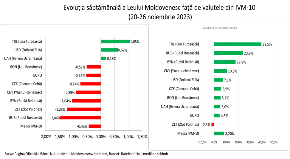 În sătămâna analizată leul moldovenesc a înregistrat o depreciere față de 7 valute din IVM-10. Cea mai mare depreciere a avut față de Rubla Rusească (-1,46%), Zlot Polonez (-1,23%) și Rubla Belarusă (-1,04%). Dar în același timp leul moldovenesc a inregistrat o apreciere în raport cu Lira Turcească(+1,05%), Dolarul SUA (+0,62%) și Hrivna Ucrainească (+0.18%). În săptămâna dată Leul s-a depreciat față de IVM-10 cu (-0,43%).