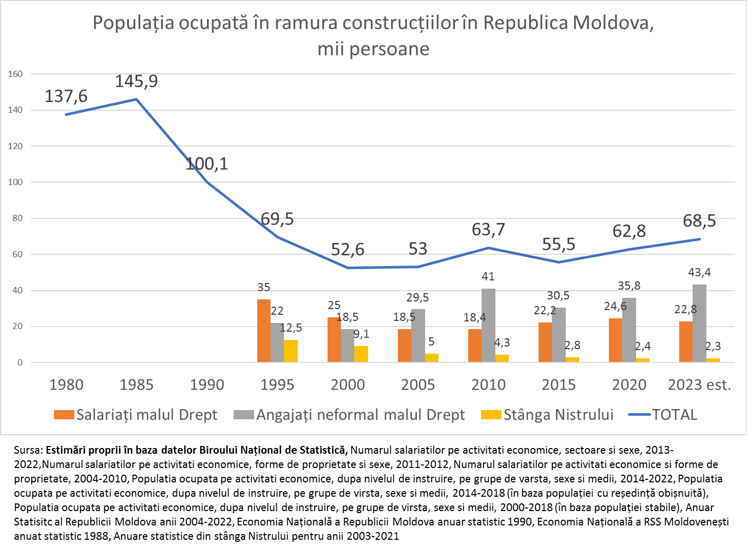 Astăzi în Moldova în ramura construcțiilor sunt ocupate 68,5 mii persoane, dintre care doar 22,8 mii au contracte de muncă și salarii plătite oficial. Alte 2,3 persoane lucrează în stânga Nistrului, iar 43,5 mii sunt ocupați în ramura construcțiilor fără un contract de muncă și fără venituri declarate oficial. În acest an numărul celor din sectorul informal a atins cota maximă din toți ani de când avem ramura construcțiilor în Moldova.