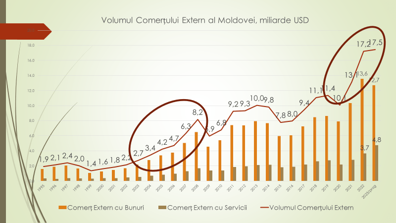Veaceslav Ioniță susține că atunci când se vorbește despre comerțul Republicii Moldova se are în vedere comerțul atât cu bunuri, cât și cu servicii. Republica Moldova a cunoscut două creșteri puternice ale comerțului extern. În perioada 2004-2008, comerțul extern, atât de bunuri, cât și de servicii, a crescut de la 2,7 la 8,2 miliarde de dolari. Între 2021 și 2022 – de la 10 la 17 miliarde de dolari. În acest an, s-a stabilizat la 17,5 miliarde de dolari, atât importul, cât și exportul. Dacă în ceea ce privește bunurile, atât exportul, cât și importul, scade. Cât privește comerțul cu servicii, va fi înregistrată cea mai mare creștere din toate timpurile de circa 1,1 miliarde dolari.