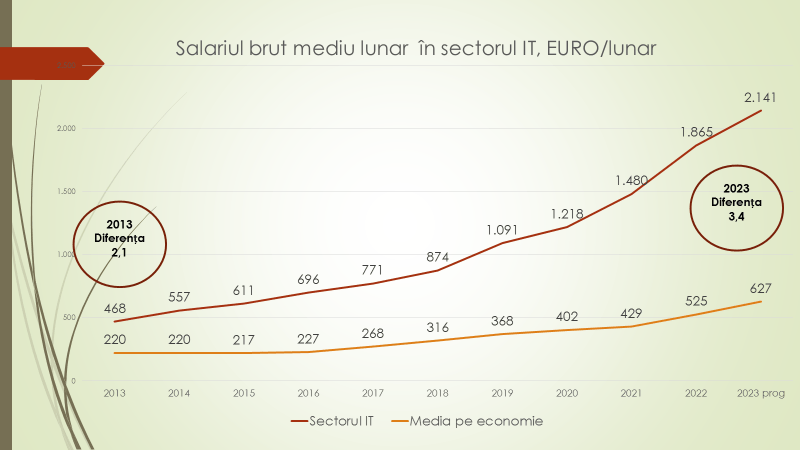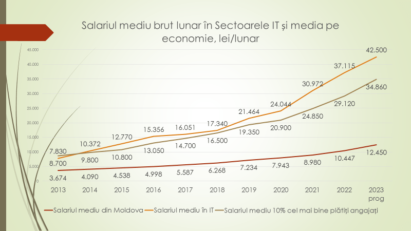 Veaceslav Ioniță mai spune că în acest an, salariul în sectorul IT va ajunge la 42500 de lei. Salariul mediu pe economie va fi de 12450 de lei. Astfel, diferența dintre salariile din IT și alte sectoare crește din ce în ce mai tare. În acest an, 10% sau 60 de mii de moldoveni vor avea un salariu mediu de aproape 35 de mii de lei. Până în anul 2018, salariul în sectorul IT era comparabil cu salariul celor mai plătiți 10% dintre salariații, deoarece serviciile se vedeau pe intern și nu se exportau. Astăzi, când aceste servicii se exportăm, salariul în IT se diferențiază cu aproape 20% de salariul celor mai bine plătiți salariați. Astfel, sectorul IT devine unul unde salariul mediu este mult mai mare decât salariul mediu al celor mai bine plătiți 10% dintre salariați. Diferența crește deoarece aceste servicii deja se exportăm din ce în ce mai mult. În sectorul IT, în acest an, pentru prima dată salariul mediu va depăși 2 mii de euro lunar. Anul trecut a fost 1.865 de euro. Salariul în sectorul IT crește cu mult mai rapid decât media pe economie.