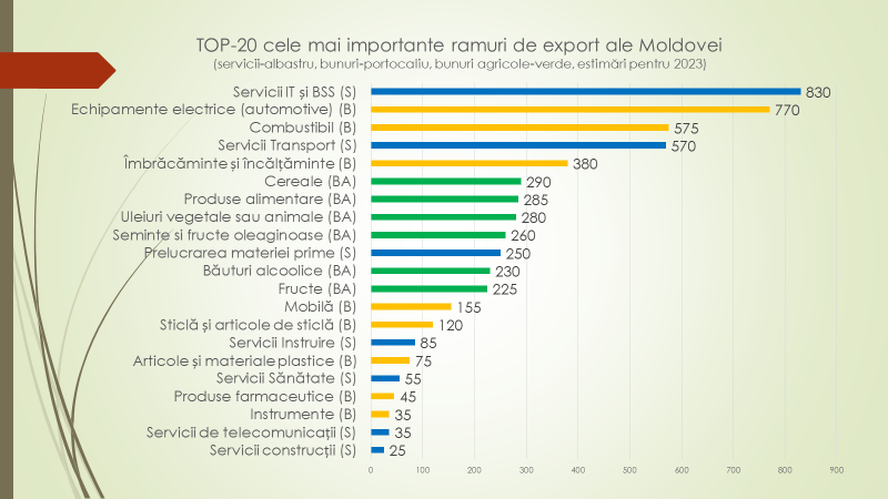 Vorbind despre principalele 20 de ramuri de export ale Republicii Moldova, Veaceslav Ioniță a declarat că serviciile IT și BSS vor atinge un volum de 830 de milioane de dolari; echipamente electrice – 770 de milioane de dolari; combustibil – 575; servicii de transport – 570; îmbrăcăminte și încălțăminte – 380; cereale – 290; produse alimentare – 285; uleiuri vegetale sau animale – 280; semințe și fructe oleagenoase – 260; prelucrarea materiei prime – 250; băuturi alcoolice – 230; fructe – 225; mobilă – 155; sticlă și articole de stică – 125. Alte ramuri sub 100 de milioane de dolari. Din cele 20 de ramuri cu potențial de export, 6 reprezintă serviciile și 14 – bunurile. Astfel, exportul de bunuri și servicii în acest an va fi de 6,9 miliarde de dolari, dintre care 4 miliarde de dolari vor fi exportul de bunuri și 2,9 miliarde de dolari – de servicii.