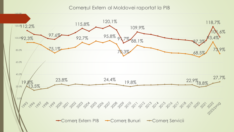 Expertul spune că economiile mari au comerțul extern la nivel de 20-40 % din Produsul Intern Brut (PIB). Își permit să producă tot de ce au nevoie și produc mult, consumă mult și astfel comerțul lor extern, raportat la PIB, nu este atât de mare și mai mult se bazează pe economia locală, decât pe cea externă. Țările mici, din contra, au un grad de deschidere enorm, deoarece au un segment îngust de produse pe care le produce în cantități enorme și trebuie să le exporte. Nu pot produce multe lucruri, pe care trebuie să le importe, și din acest motiv, au o deschidere a economiei lor care se măsoară prin volumul comerțului extern, raportat la PIP, destul de mare. „În Republica Moldova comerțul extern este la nivel de 100% din PIB. A atins de câteva ori maxime de 120%. În 2022 a fost 118%. În acest an este o scădere din contul exportului de bunuri. În cazul serviciilor, a fost stabil pe tot parcursul timpului, cu o tendință clară de creștere. Cât privește bunurile, suntem dependenți de criză, de condițiile climaterice, de prețuri etc.. Republica Moldova trebuie să se specializeze pe exportul de servicii, deoarece ne asigură cea mai mare stabilitate a încasărilor. Avem o balanță comercială negativă la bunuri și una pozitivă la servicii”, a spus expertul.