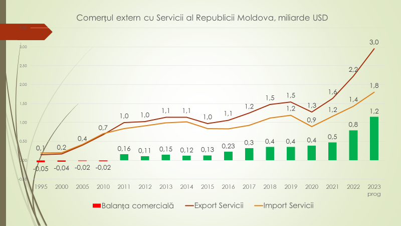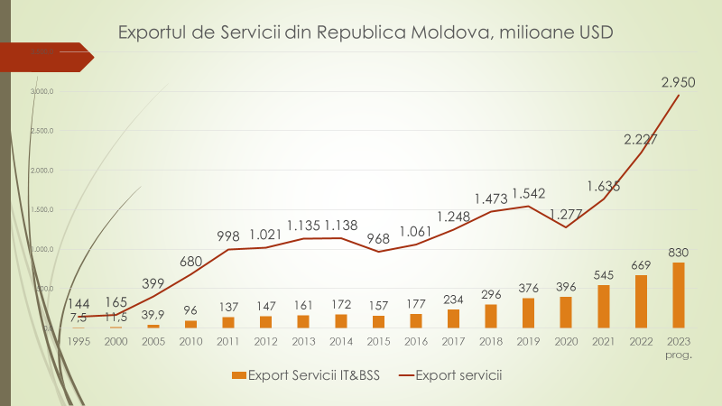 Potrivit economistului, în acest an, din totalul exportului de servicii, de 2,9 miliarde de dolari, 830 de milioane de dolari va fi exportul de servicii IT și BSS, care în 2010 era de 96 de milioane de dolari. Până în 2016, în Republica Moldova domina exportul de servicii BSS, iar în ultimii 7 ani domină cele din domeniul IT, schimbări care s-au produs pe fundalul modificărilor legislative atunci când s-au creat parcurile IT. Astfel, exportul de servicii IT va ajunge în acest an, cel mai probabil, la 615 milioane de dolari, iar BSS – 215 milioane de dolari.