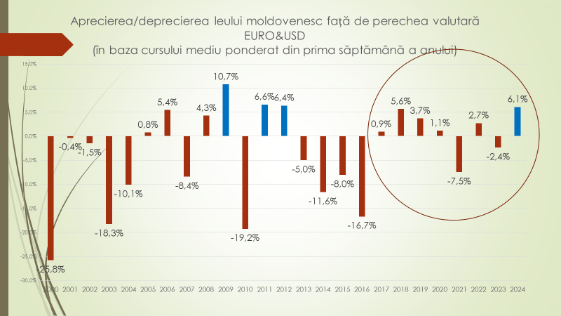 Veaceslav Ioniță susține că leul moldovenesc, pe parcursul unui an se apreciază, se depreciază, însă sfârșește și începe anul cam la același nivel. Totuși, în prima săptămână din 2024, a fost cu 6,1% mai puternic față euro și dolar comparativ cu prima săptămână a anului trecut, când a fost cu 2,4% mai slab față de euro și dolar în prima săptămână a anului 2022. În 2000, a fost, în prima săptămână a anului, cu 25,8% era mai slab față de euro și dolar. „Timp de 25 de ani, leul moldovenesc, practic jumătate din această perioadă a început anul mai puternic față de anul precedent și cealaltă jumătate mai slab. Doar trei ori a fost mai mare față de cât este acum – 6,1%. În 2009 s-a apreciat cu 10,7%; în 2011 cu 6,6%; și în 2012 cu 6,4%”, a spus Veaceslav Ioniță.
