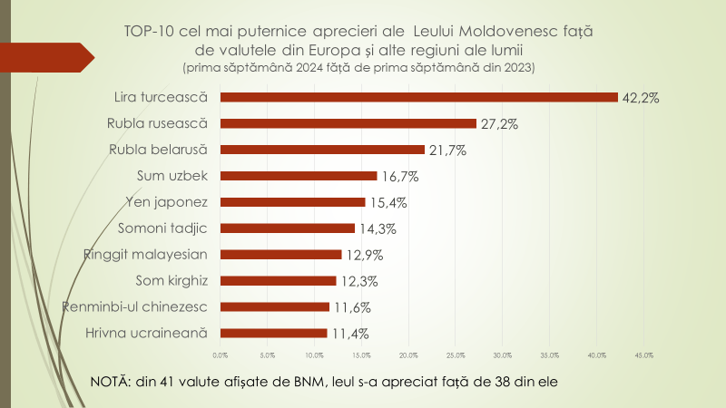 „În acest an, leul moldovenesc a început anul mai puternic față de 38 de valute. Doar față de trei valute a înregistrat o ușoară scădere. Doar în 2017 a mai fost așa ceva. Atunci a fost puternic față de toate valutele din Europa. Acum, din cele 41 de valute care sunt pe pagina Băncii Naționale a Moldovei (BNM), față 38 de valutae leul moldovenesc a început anul mai puternic. Față de lira turcească cu 42,2%, față de rubla rusească – cu 27,2% și față de rubla belarusă cu 21,7% mai puternic”, a spus expertul.