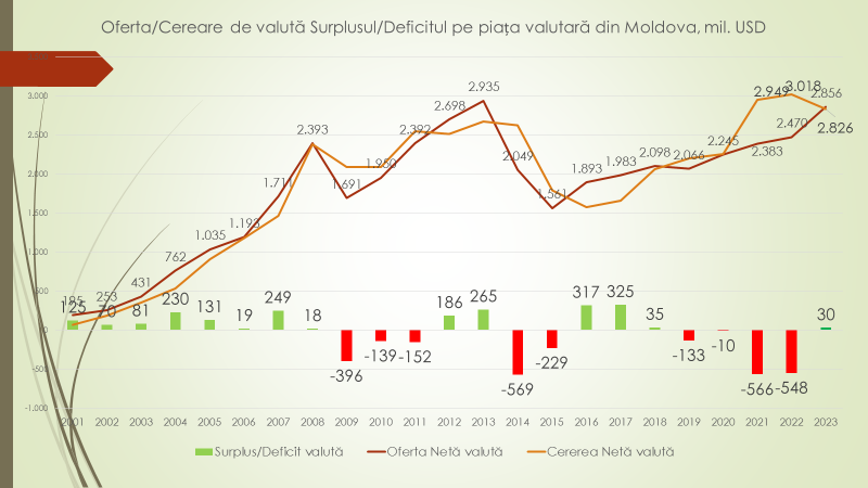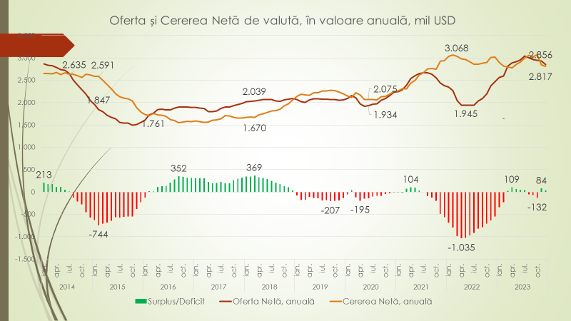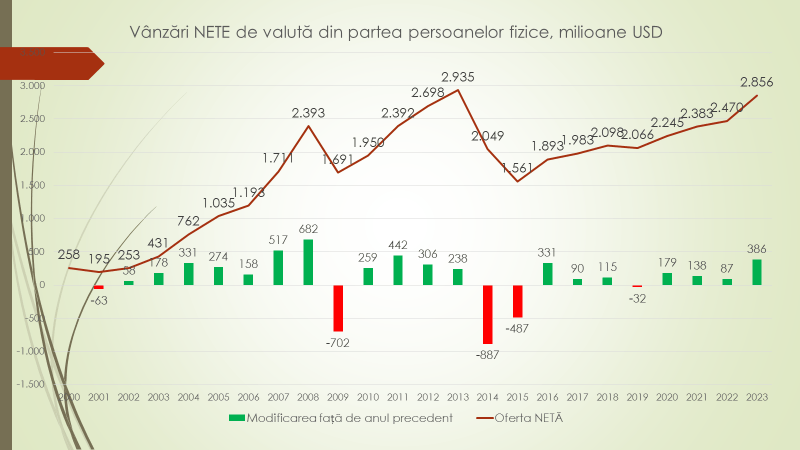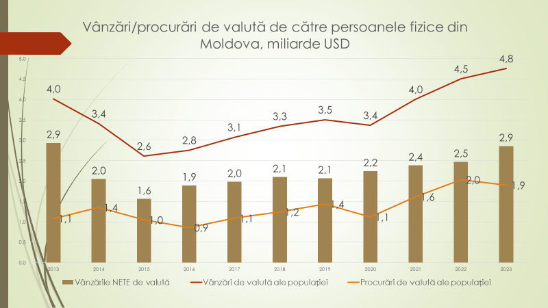 Economistul afirmă că piața valutară este influențată de cererea de valută din partea agenților economici, de oferta de valută din partea populației și de alte mișcări pe piața valutară, cum ar fi: intervenția BNM, care cumpără/vinde valută, ca rezultat al volumului de valută intrat în țară. În 2023 a fost un record de vânzare de valută din partea populației – de 4,8 miliarde de dolari. Precedentul record a fost anul 2022 – de 4,5 miliarde de dolari, apoi anul 2021 – de 4 miliarde de dolari. Dar, au fost și procurări mari de valută. Anul trecut, 1,9 miliarde de dolari au fos procurările de valută din partea populației. În 2022, de 2 miliarde de dolari, iar în 2021 – de 1,6 miliarde de dolari. Total, vânzările nete de valută au fost în 2023 de 2,9 miliarde de dolari. O singură dată a mai fost așa, în 2013.