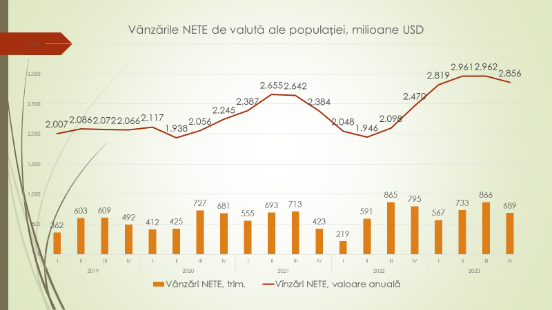 „Este a doua oară în istoria Republicii Moldova, când vânzările nete de valută ale populației a fost de 2,9 miliarde de dolari. Comparativ cu 2022, anul trecut, a crescut cu 400 de milioane de dolari vânzarea de valută. Cu excepția anului 2019, în fiecare an au fost înregistrate creștere ale vânzărilor nete de valută din partea populației. În 2023 a fost cea mai mare creștere din ultimii 12 ani. Cu 386 de milioane de dolari au crescut vânzările nete de valută ale populației comparativ cu 2022. Anul trecut, vânzările nete de valută ale populației au crescut până în trimestrul II. După, a înregistrat o stabilizare, iar în trimestrul IV au înregistrat chiar o scădere. În prezent, această tendință, care a fost în 2023, se epuizează și se va înregistra o ușoară scădere de vânzare de valută din partea populației”, a afirmat economistul.