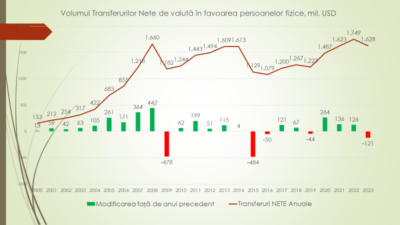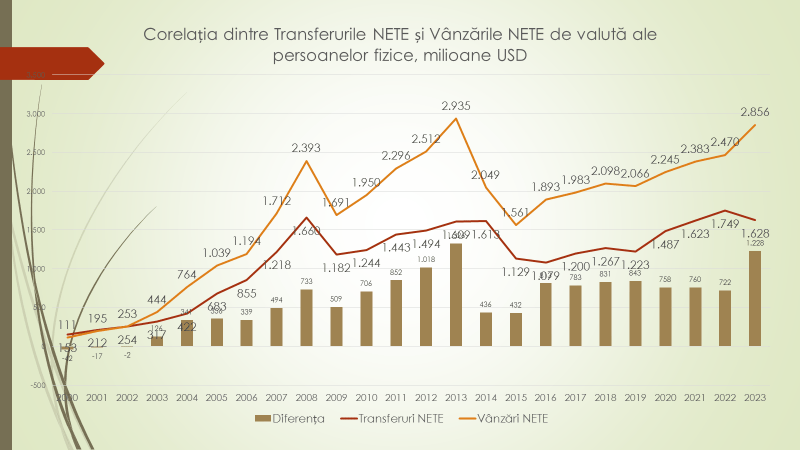 Potrivit lui Veaceslav Ioniță, nu remitențele au influențat în totalitate piața valutară în 2023. Remitențele care vin oficial în țară sunt de 1,5-1,7 miliarde de dolari, iar vânzările nete de valută ale cetățenilor sunt de 2,4-2,5 miliarde de dolari. Și din totdeauna a existat o discrepanță dintre banii pe care moldovenii îi trimit oficial în țară și banii pe care îi vând. În fiecare an este o diferență de vreo 500-700 de milioane de dolari dintre banii care oficial au venit în țară și banii pe care erau moldovenii i-au vândut. În 2023, a fost înregistrat un fenomen care nu a mai fost. Remitențele au scăzut, iar vânzările nete de valută ale populației au crescut. În 2022, moldovenii au primit de peste hotare 1 miliard 749 de milioane de dolari, iar în 2023 – 1 miliard 628 de milioane de dolari. În 2022, moldovenii au vândut 2 miliarde 470 de milioane de dolari, iar în 2023 – 2 miliarde 856 de milioane de lei. Dacă în 2022 diferența a fost de 700 de milioane de dolari, în 2023 – de 1 miliard 228 de milioane de dolari.
