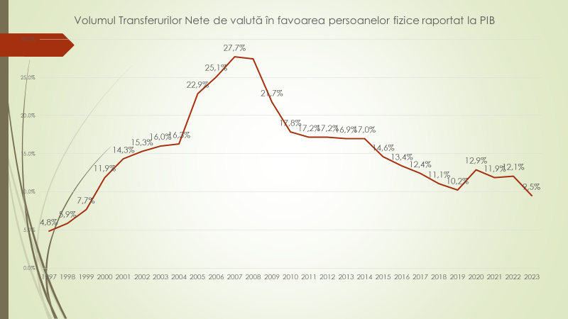 Analistul economic menționează că primul factor care influențează piața valutară sunt remitențele. Însă, din păcate, epoca de aur a remitențelor în Republica Moldova e pe sfârșite. Acestea nu mai joacă rolul care la jucat cândva, nu mai determină creșterea și dezvoltarea țării, iar între timp nu s-a reușit să se substituie remitențele prin investiții, atragerea de bani și creștere economică locală. În 2022, remitenețele au fost de 1 miliard 749 de milioane de dolari. În 2023 au scăzut la 1 miliard 628 de milioane de dolari. Minus 121 de milioane de dolari. Remetențele, raportate la Produsul Intern Brut (PIB), în 1997 au reprezentat 4,8%. În 1999 – 7,7%. În 2007 au ajuns 27,7% din PIB și au ajuns să fie mai mari decât salariile și exporturile Republicii Moldova. „În 2023, remitențele au reprezentat 9,5% din PIB. Minimum istoric din ultimii 25 de ani. Acestea vor avea o tendință clară de scădere și în 2024. Acest lucru trebuie să preocupe guvernarea. Remitențele nu mai sunt ceea ce au fost și dacă nu vom avea alt factor de stabilitate economică, vom avea o problemă”, a menționat analistul economic.