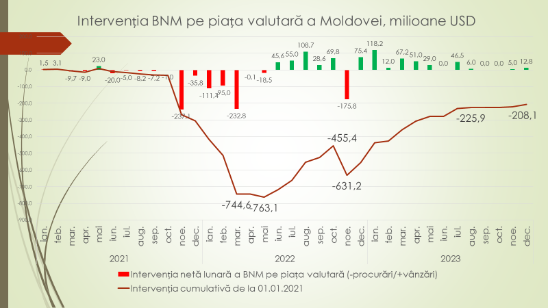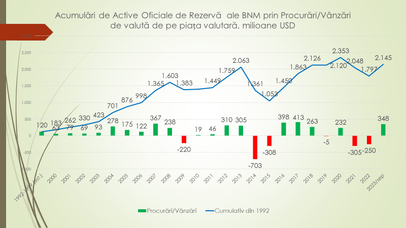 Potrivit analistului economic, criza din 2020 pe fundalul pandemiei și criza energetică din 2021 și 2022, au lovit piața valutară moldovenească, dar cetățenii nu prea au simțit efectele negative, deoarece BNM a intervenit cu cele mai puternice măsuri care au fost vreodată. Din decembrie 2022 și până în prezent, BNM doar a procurat valută și s-au recuperat 550 de milioane de dolari din cele 750 de milioane de dolari pe care a fost nevoită să le vândă în perioadele de criză. Acum, când este o presiune de apreciere a leului, BNM, ca să nu permită leului să se întărească, cumpără valută. Într-un an și jumătate a cumpărat 550 de milioane dolari și mai are de cumpărat 200 de milioane dolari. În toată istoria Republicii Moldova, BNM a cumpărat de la populație 2 miliarde și 145 de milioane dolari. Doar în 2023 o cumpărat 348 de milioane de dolari. În 2009, 2014, 2015, 2021 și 2022 a vândut valută, iar acum procură înapoi.