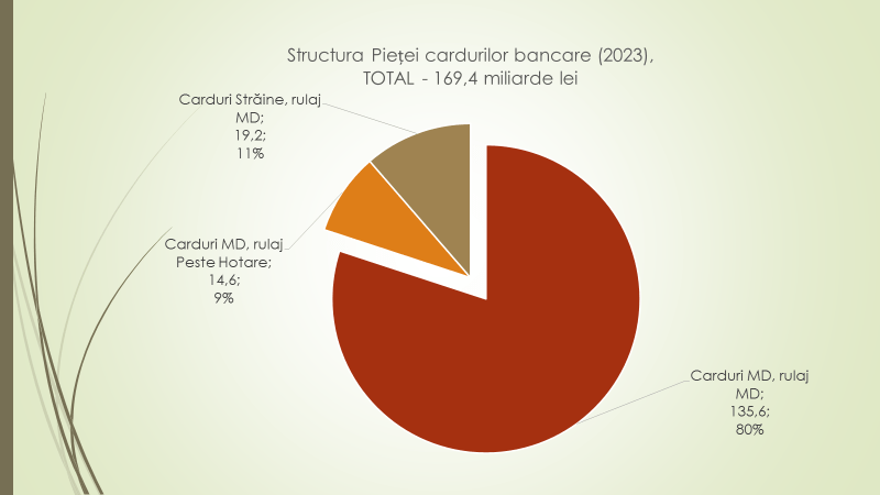„Din totalul celor 169,4 miliarde de lei, cât au constituit achitările cu cardurile bancare în 2023, 135,6 miliarde de lei sau 80% au fost efectuate cu cardurile moldovenești; 19,2 miliarde de lei sau 11% cu cardurile străine pe teritoriul Republicii Moldova; iar 14,6 miliarde de lei sau 9% cu cardurile molovenești peste hotare”, a spus Veaceslav Ioniță.