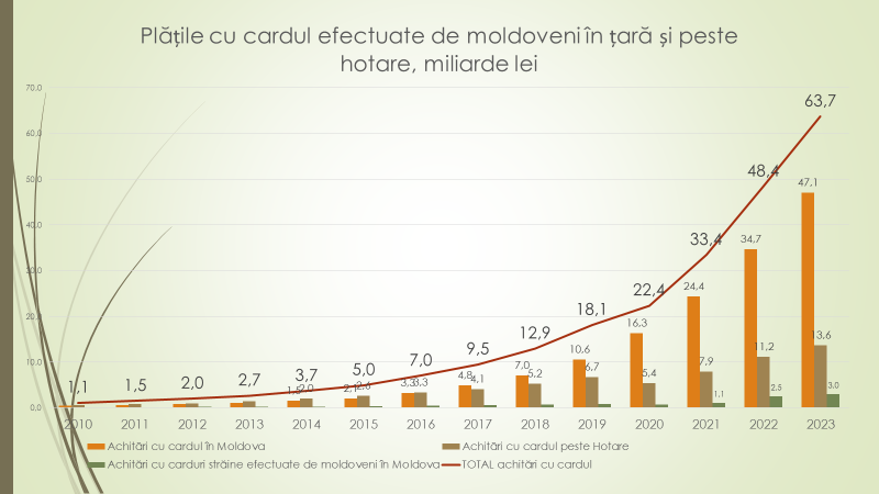 Potrivit expertului, dacă în 2010, moldovenii au făcut achitări cu cardul, în țară și peste hotare, de 1,1 miliarde de lei, în 2023 – rulajul a ajuns la 63,7 miliarde de lei, dintre care: achitările cu cardul moldovenesc în țară – 47,1 miliarde de lei; achitările cu cardul moldovenesc peste hotare – 13,6 miliarde de lei și achitările cu cardurile străine ale moldovenilor în Republicii Moldova – 3 miliarde de lei.