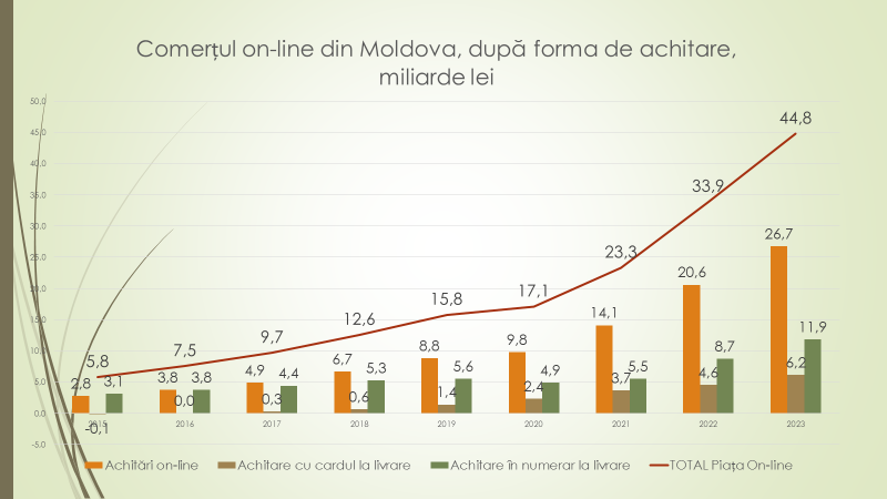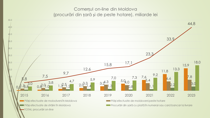 Economistul estimează că piața comerțului online din Republica Moldova a ajuns în 2023 la 44,8 miliarde de lei. Din care: 18 miliarde de lei au fost procurările online din țară, dar plata a fost în numerar sau cu cardul la livrare; 15,9 miliarde de lei au fost plățile efectuate online de către moldoveni țară; 7,8 miliarde de lei – plățile moldovenilor peste hotare, iar 3 miliarde de lei – plățile străinilor în Republica Moldova.