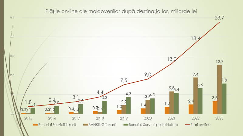 „În 2023, moldovenii au făcut achitări online de 23,7 miliarde de lei. Cu 5,3 miliarde de lei mai mult față de 2022 și cu 10,7 miliarde de lei mai mult față de 2021. Din cele 23,7 miliarde de lei: 12,7 miliarde de lei au mers spre achitarea serviciilor comunale și a altor tipuri de taxe; 7,8 miliarde de lei – achitarea de bunuri și servicii peste hotare; 3,3 miliarde de lei – bunuri și servicii în țară”, a declarat economistul.