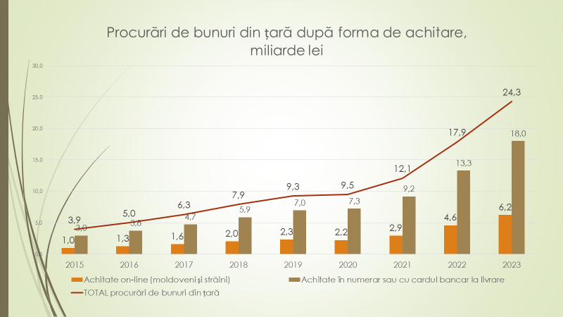 Expertul menționează că procurările online de bunuri din țară au constituit în 2023 – 24,3 miliarde de lei, față de 17,9 miliarde de lei în 2022. Dintre care: 18 miliarde de lei au fost achitările în numerar sau cu cardul la livrare; și 6,2 miliarde de lei achitările online.