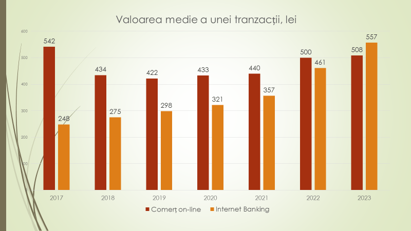 Veaceslav Ioniță a mai declarat că în 2023 moldovenii au realizat 40 de milioane de tranzacții cu cardurile bancare, în 2022 – 36,5 milioane, iar în 2021 – 31,1 milioane. Valoarea unei tranzacții anul trecut a constituit, în mediu, 557 de lei prin intermediul internet banking și 508 lei – comerțul online. În 2022 – 500 de lei a fost comerțul online și 461 de lei – internet banking.