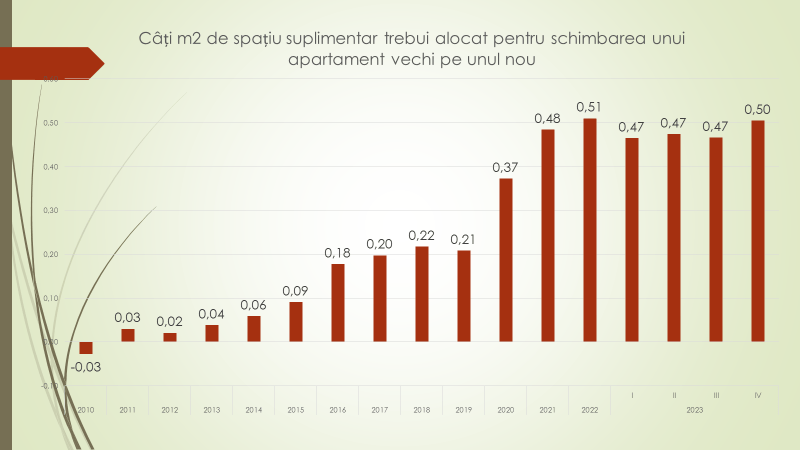 Câți metri pătrați de spațiu locuibil vechi trebuie să vinzi ca să cumperi spațiu nou. În 2010, potrivit expertului, era nevoie să se vândă 97 de metri pătrați de locuință veche pentru a procura 100 de metri pătrați de locuință nouă. În prezent, trebuie să se vândă 150 de metri pătrați sau cu 50% mai mult. Dacă înainte era nevoie de schimbat un apartament vechi și de adăugat încă 20% din sumă pentru a procura aceeași suprafață de apartament, din 2020 trebuie de adăugat deja 50%.