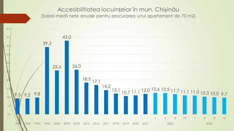 Câți ani trebuie să lucreze un locuitor al Chișinăului ca să-și procure apartament. În 1980 erau necesari 9,3 ani de muncă; în 1990 – 9,8 ani; în 1995 – 39,3 ani; în 2005 – 43 de ani; 2010 – 26 de ani; 2020 – 11,1 ani; 2021 – 12 ani. În trimestrul IV, 2022 – 11,1 ani, iar în trimestrul IV din 2023 – 9,7 ani.