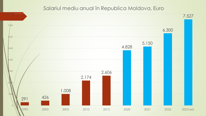 Salariul mediu anual în Republica Moldova. În 1995 acesta era de 291 de euro; în 2000 – de 496 de euro; în 2005 – de 1008 euro; 2010 – 2174 de euro; 2015 – 2606 euro; 2020 – 4828 de euro; 2021 – 5150 de euro; 2022 – 6300 de euro; 2023 – 7527 de euro.