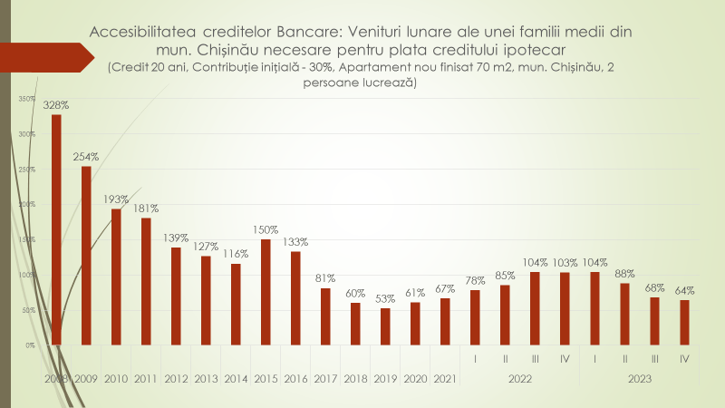 Accesibilitatea creditelor bancare. Potrivit lui Veaceslav Ioniță, în anul 2008, o familie interesată de un apartament de 70 de metri pătrați, accesând un credit ipotecar pentru 20 de ani, cu o contribuție inițială de 30%, unde două persoane muncesc, erau necesare trei salarii lunare ale unui membru al familiei. De trei ori mai mult decât câștigă. În 2018 s-a ajuns la 60%, iar în 2019 – la 53% din veniturile lunare. Jumătate din veniturile lunare ale familiei mergeau pentru întoarcerea creditului ipotecar. În 2020 și 2021, între 60% și 70% din veniturile unei familii mergeau pe creditele ipotecare. În trimestrul III din 2022 a ajuns 100%. Situație dată s-a menținut până în trimestrul I din 2023. Ulterior, a început să scadă, iar în trimestrul IV din 2023 a ajuns 64%. Expertul estimează că în trimestrele II și III din 2024, accesibilitatea creditelor va ajunge, din nou, la 50%.