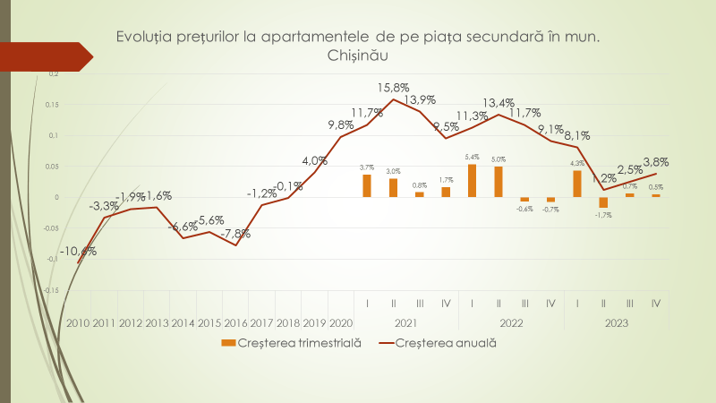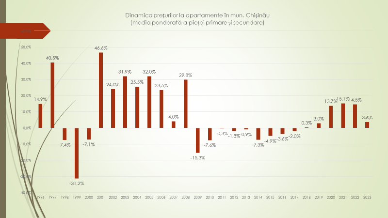 Dinamica prețurilor la apartamente în municipiul Chișinău. Potrivit expertului, în 1997 a fost o creștere a prețurilor la apartamente de 40,5%. Criza din 1998 a dus la scăderea prețurilor apartamentelor cu 7,4% în 1998; cu 31,2% în 1999; și cu 7,1% în 2000. După 2000, după valul de migrație generat de criza din 1998, când moldovenii au început să plece masiv peste hotare, prețul a început să crească. În 2001 a fost înregistrată o creștere de 46,6%; în 2005 de 32%. Creșterea a ținut până în 2008, când a ajuns la 29,8%. După criza din 2008 și până în 2018, piața imobiliară din Republica Moldova a cunoscut cea mai lungă perioadă de scădere și stagnare a prețurilor. În 2009, prețurile apartamentelor au scăzut cu 15,3%, în 2013 cu 7,3%, iar în 2017 cu 2%. Prima creștere a fost înregistrată în 2018 de 0,3%. În 2019 a fost de 3%, în 2020 – de 13,7%, în 2021 – de 15,1%, în 2022 – de 14,5%, iar în 2023 – de 3,6%. În 2023 s-a atestat o temperare a creșterii, iar în prezent se înregistrează o creștere.