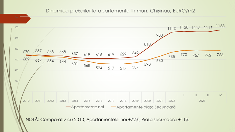 Veaceslav Ioniță menționează că până în 2010 apartamentele vechi se vindeau mai scump decât apartamentele noi. În 2010, un metru pătrat de locuință de pe piața secundară costau 689 de euro, iar în 2012 – 667. Pe piața primară – 670 de euro costa în 2010 și 687 de euro în 2011. După, a urmat o stagnare a prețului la apartamentele noi până în 2019, când un metru păstrat de apartament a ajuns să coste 649 de euro. Din 2020 a început creșterea, ajungând la 810 euro și la 1110 euro în 2022. În trimestrul IV din 2023, prețul unui apartament nou a ajuns să coste 1153 de euro. În cazul apartamentelor vechi, de la 689 de euro în 2010, s-a ajuns la 537 de euro în 2019 și la 590 de euro în 2020. În 2021 – 660 de euro a ajuns să conte un metru pătrat de spațiu locativ, în 2022 – 735 de euro. În trimestrul IV din 2023 – 766 de euro.